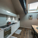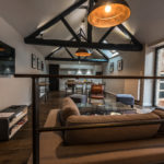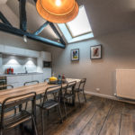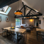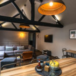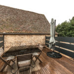 Un grand salon/séjour 37 m² avec un vieux plancher, splendides poutres, télévision & coin repas et accès à une terrasse privative exposée plein sud avec table et chaises et parasol Cuisine tout équipée : four, cuisinière, hotte aspirante, réfrigérateur, congélateur, four micro-ondes, lave-vaisselle.